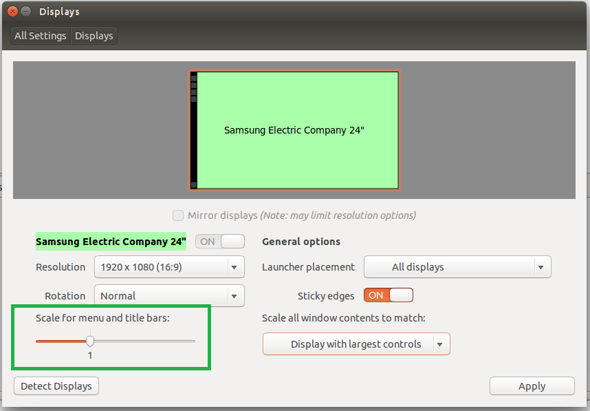 First, check to see what the current display scaling is set to in your display settings. Below is a screenshot of this taken from Ubuntu 14.04.