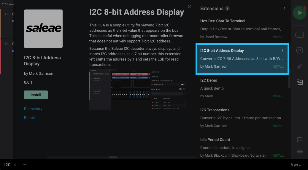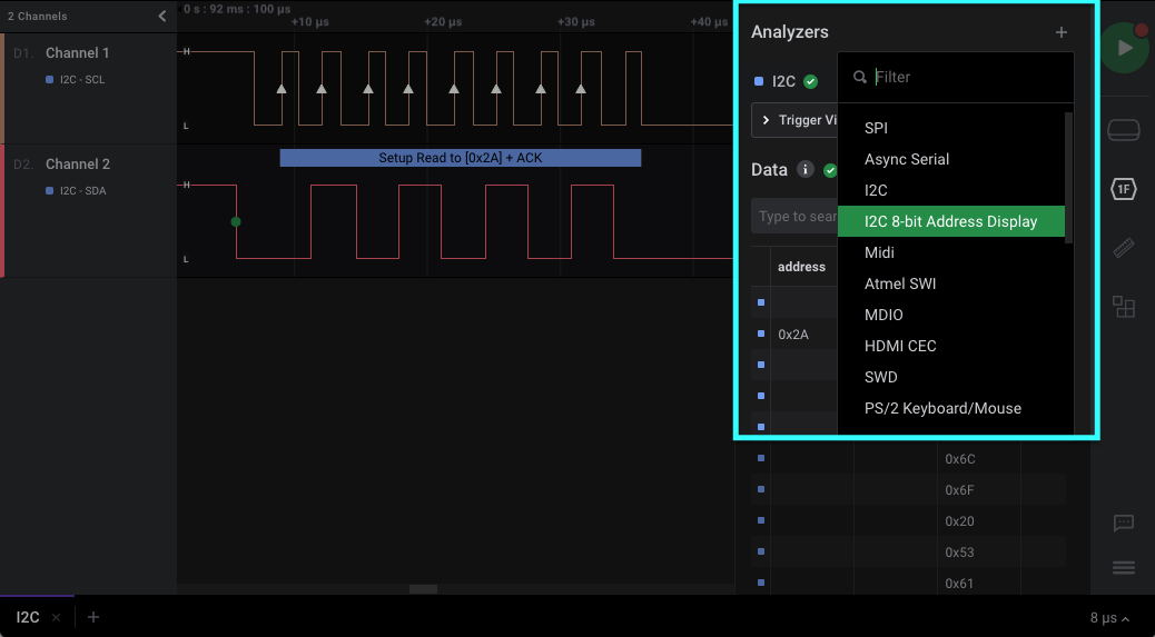 In certain scenarios, it may be preferred to view the address field as an 8-bit value (incorporating the R/W bit). We’ve added a high level analyzer (HLA) extension that allows for this feature.