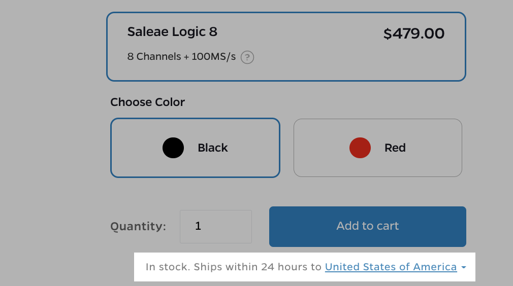 For Logic analyzer products, click “Buy Logic Analyzers” at the top and select the product of interest. Afterwards, select the destination country at the bottom-right and you will find a note about its stock status and when it will ship.