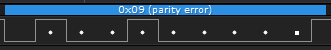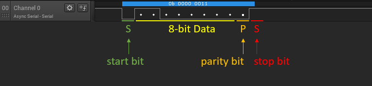 Parity is a feature where the serial transmitter includes an extra bit of information after transmitting the data word but before the stop bit that helps the receiver detect possible bit errors caused by line noise. In Logic software, the parity bit is signified by the bolded square dot, as shown in the figure below.