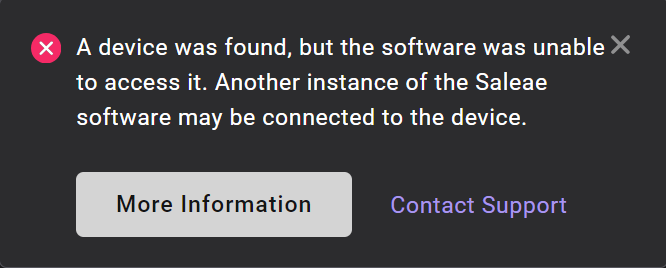 A device was found, but the software was unable to access it. Another instance of the Saleae software may be connected to the device.