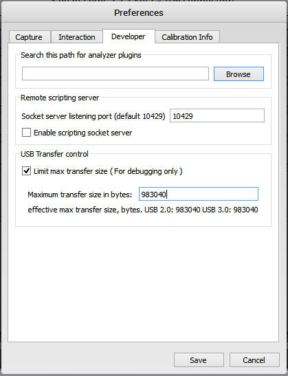 To do so, open the preferences dialog from the main options menu and navigate to the developer tab. Check the box to limit the max transfer size and then enter the new maximum transfer size in bytes.