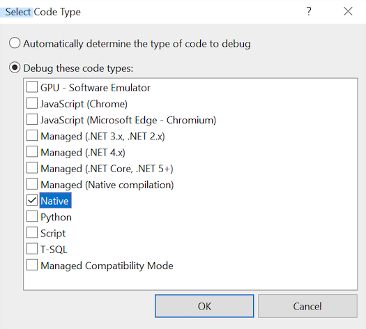 Specifically, “Native code” needs to be selected in the Debug menu in Visual Studio.