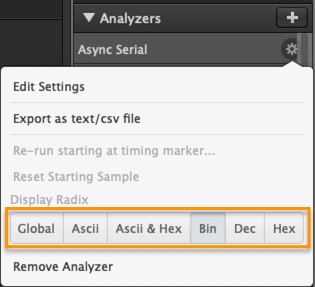 Every added protocol analyzer can be configured with a different display radix as shown below.