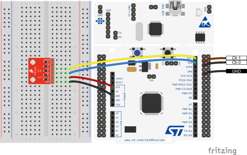 Solder header pins to the TMP102 breakout board, and connect the Nucleo to the TMP102 breakout board as shown in the following diagram. Note that GND, SDA, and SCL are broken out to the male pins to the right of the female Arduino headers on the Nucleo. This setup allows us to attach the Saleae Logic Analyzer wires.