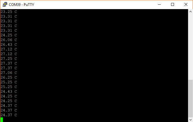 Connect to the Nucleo board over the assigned serial port with a baud rate of 115200, 8 data bits, no parity bit, and 1 stop bit (8-N-1). Open the connection, and you should see the temperature (in Celsius) being reported to you in regular intervals. Try breathing on the TMP102 sensor to change the readings.
