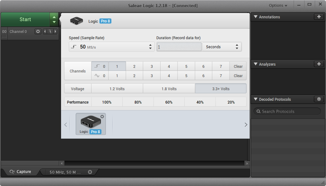 In the device settings window, set the speed to at least 50 MS/s and the duration to 1 second. Click both Clear buttons to disable all channels, leaving only digital Channel 0 enabled. Click digital Channel 1 to enable it as well.