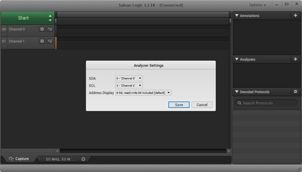 Set the protocol analyzer by clicking on the plus button (+) next to Analyzers on the right side. Select I2C to bring up the settings window. Leave everything as default and click Save.